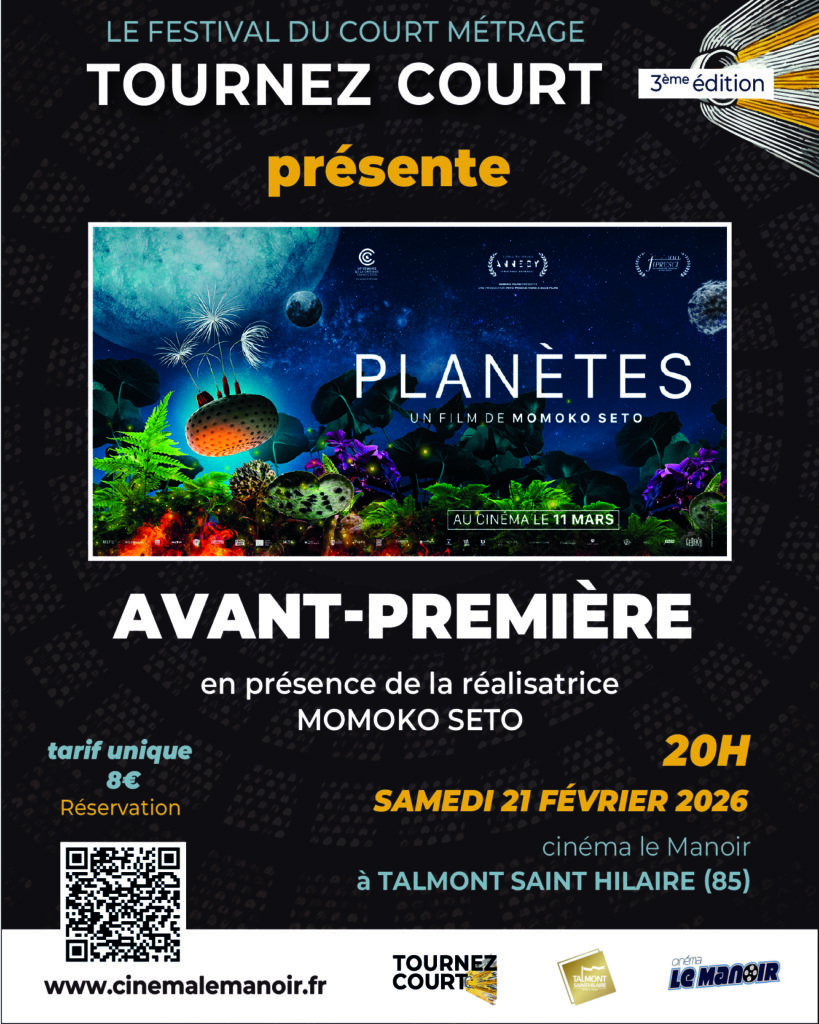Dans le cadre de ses actions culturelles menées tout au long de l’année, l’association TOURNEZ COURT, organisatrice du festival éponyme à Talmont-Saint-Hilaire, propose deux projections exceptionnelles du film Planètes de la réalisatrice Momoko Seto, en avant-première. Ces séances s’inscrivent dans une programmation HORS FESTIVAL, pensée comme un prolongement naturel de la démarche artistique et pédagogique portée par l’association.